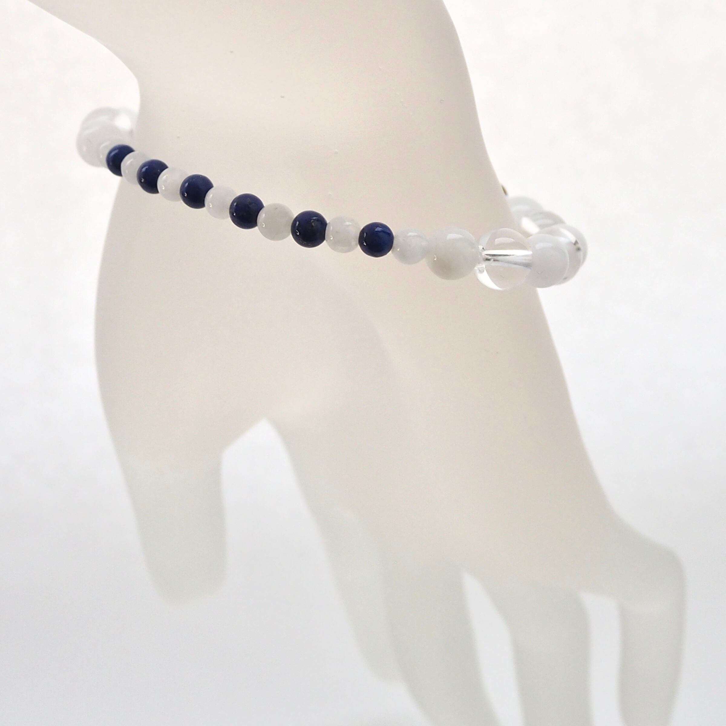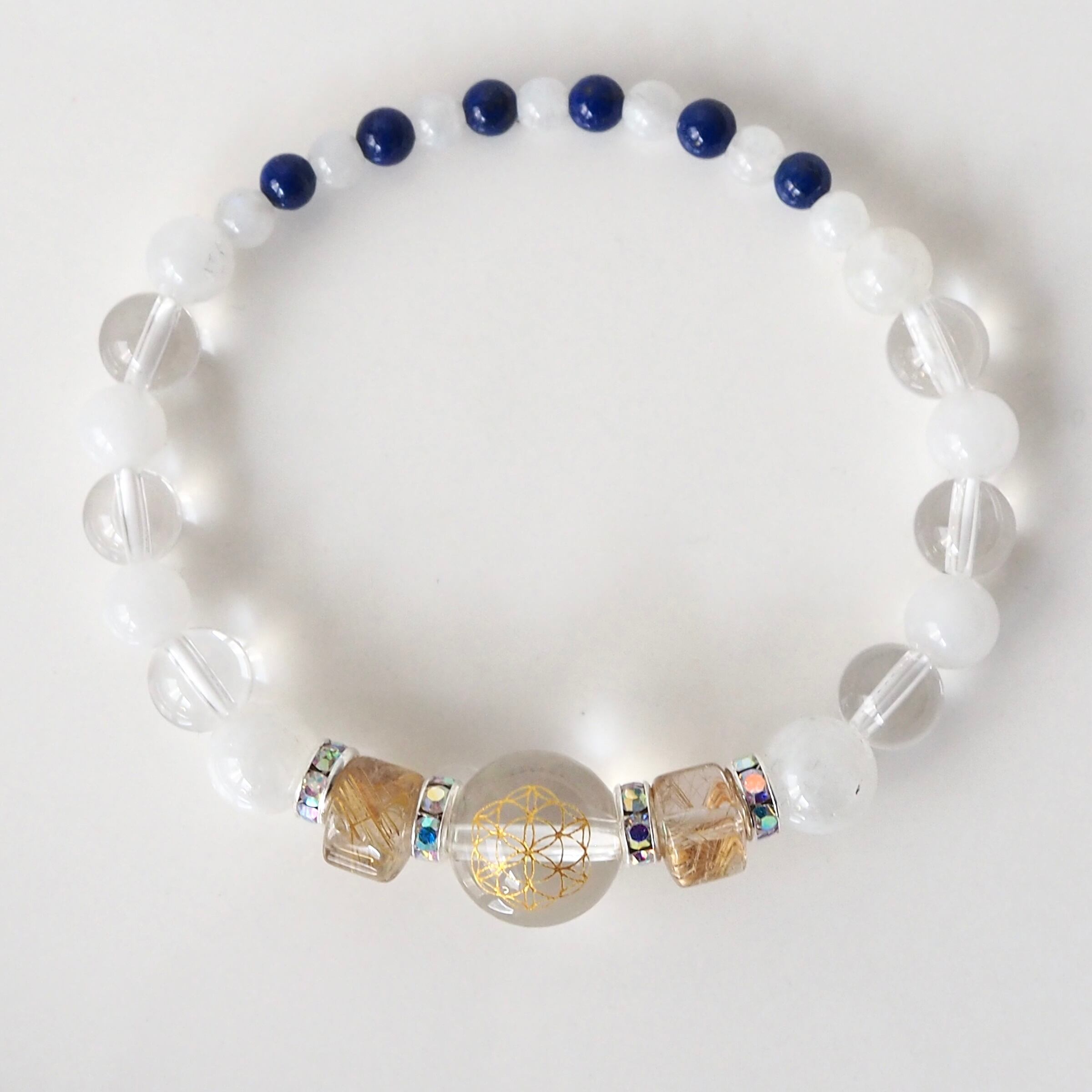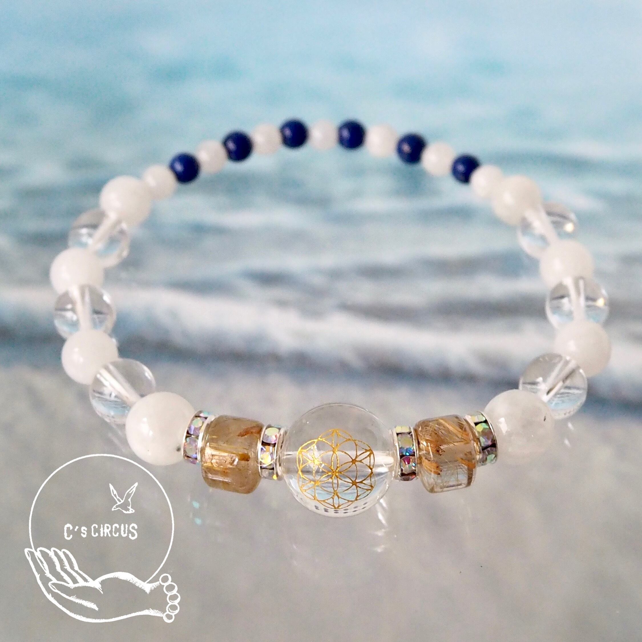 宇宙を表す神聖幾何学フラワーオブライフの12m mクリスタルクォーツ(水晶)を中心に金運アップのルチルクォーツ、潜在意識を引き出すムーンストーンとラピスラズリで囲みました。
