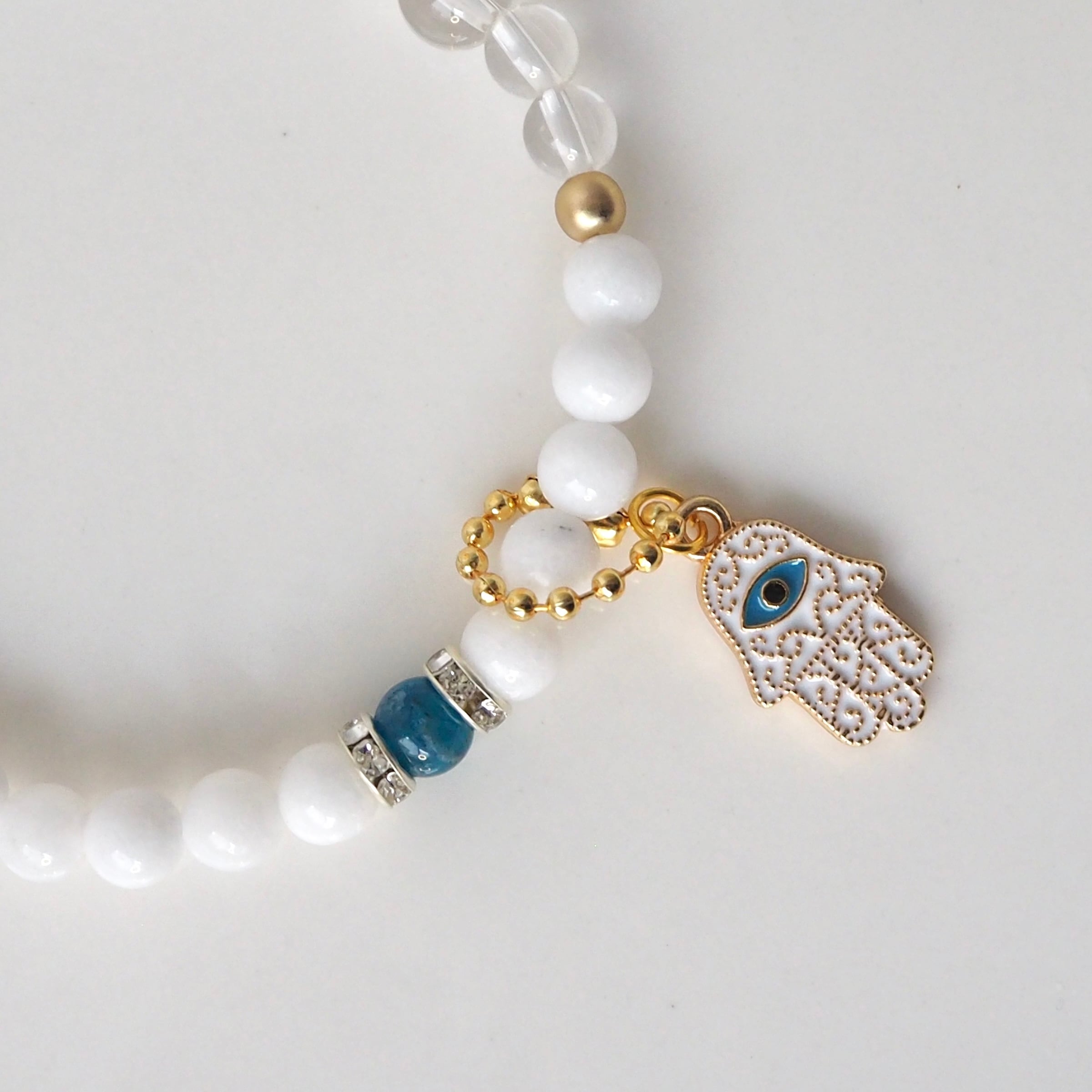 神の手と呼ばれるハムサのチャームをメインに、クリスタルクォーツ・ホワイトクォーツの水晶で囲み何事をも繋げる意味のアパタイトをワンポイントにしたデザインです。