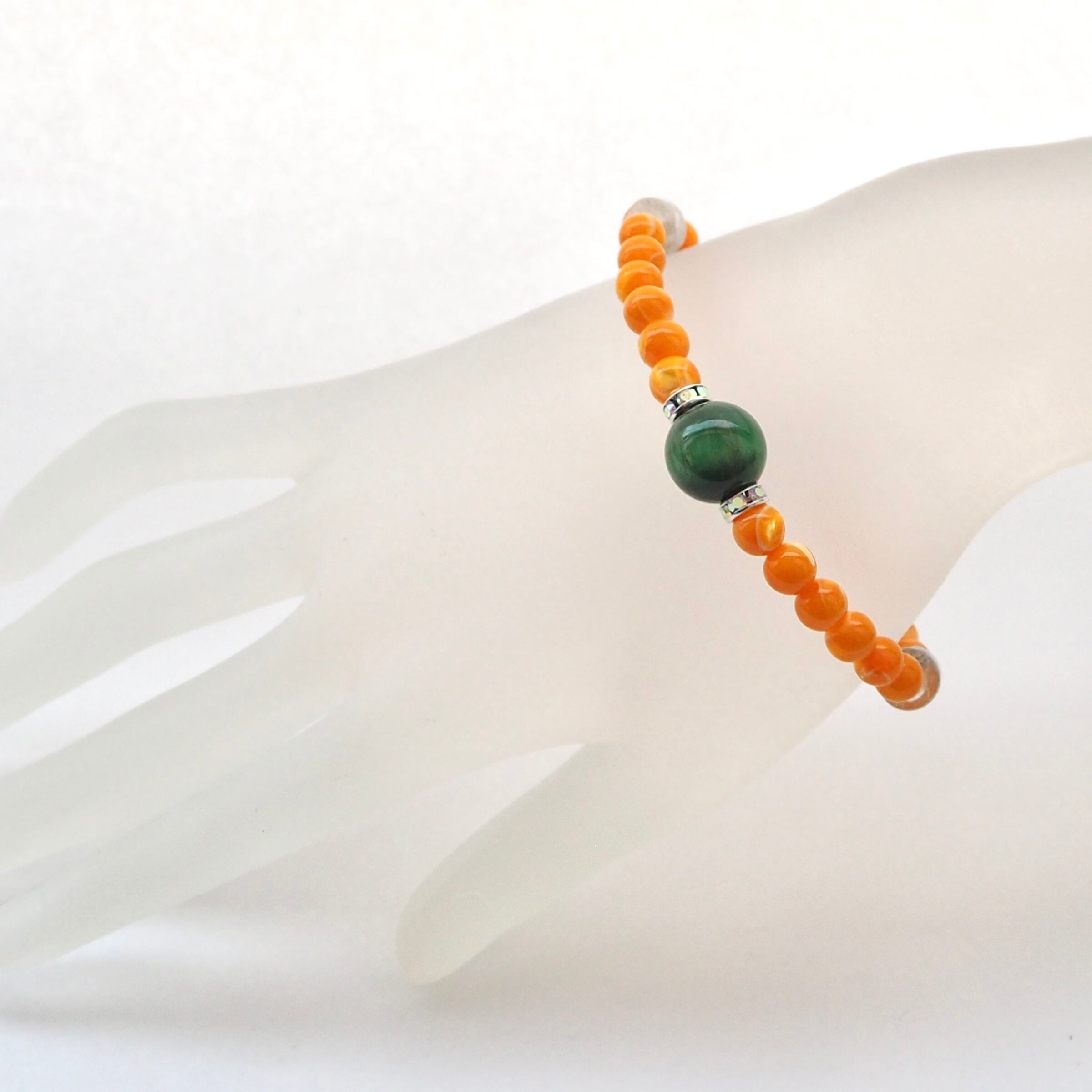 金運仕事運の大きめのタイガーアイ、財運アップのルチルクォーツ、絆を深めるマラカイトをポイントに心身をバランスよく癒すマザーオブパールで囲んだデザインです。